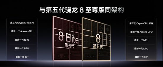第五代骁龙 8,用上了不少至尊版同款配置,像是自研Qualcomm Oryon CPU 架构、切片组设计的 GPU…
